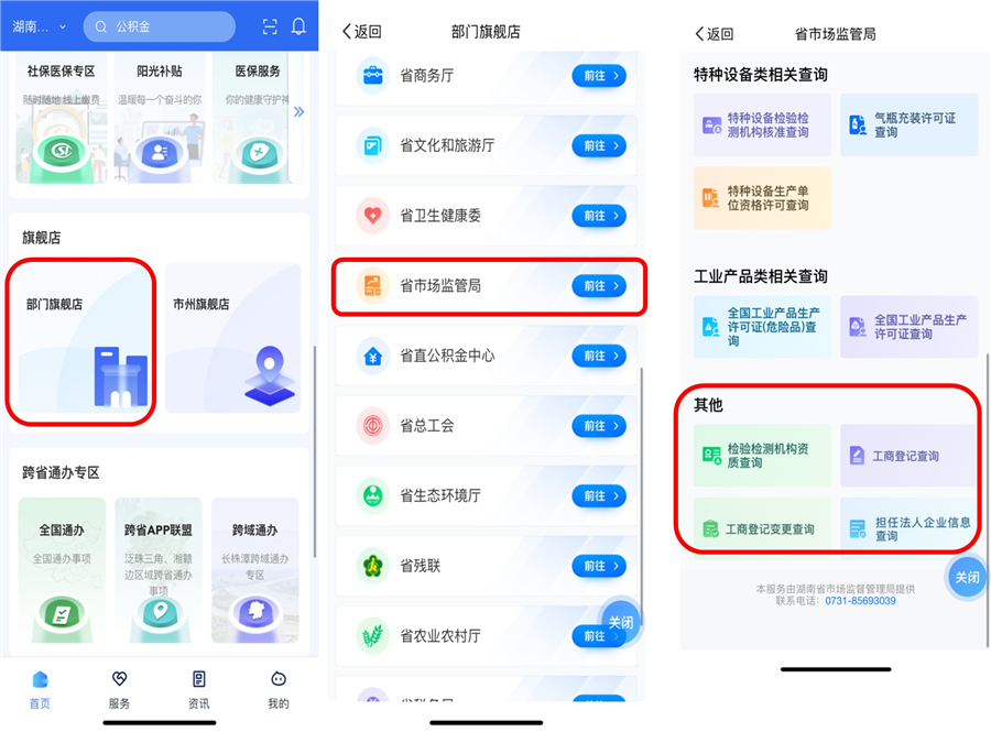 登陆“湘易办”后,在首页“部门旗舰店”中选择“省市场监督管理局”,在“其他”栏目中点击对应服务名称即可进入;或在首页直接搜索相应服务名称进入。