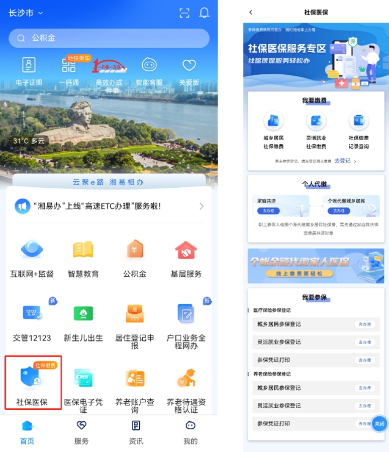 登录“湘易办”APP,或“湘易办”支付宝、微信小程序,点击首页金刚区“社保医保”,即可进入“社保医保专区”。