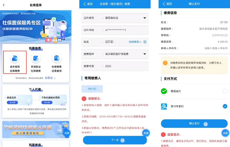 在“社保医保专区”进入城乡居民社保缴费服务页面,填写需缴费的参保人员信息,选择城乡居民医疗保险缴费险种,并选择2025年缴费年度。核对信息无误后点击“下一步”进行缴费,然后选择支付方式,点击“确认支付”进行缴费。