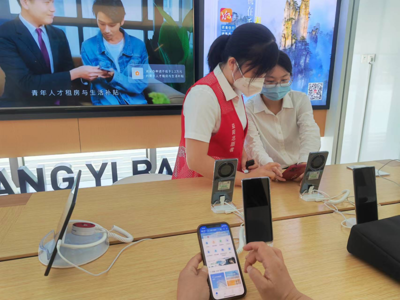 体验中心分为视频演示区和手机终端演示区,配备了专人指导、专业导办。视频演示区通过循环播放“湘易办”宣传推广视频展示“湘易办”各项便民功能,终端演示区配有四台手机和两台平板,用户登录后,即可全景式、沉浸式体验查询、办理相关业务,为群众提供更直观、更便捷的“指尖触达、掌上通办”体验。