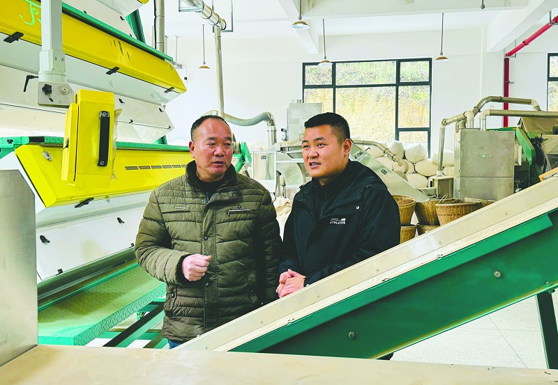 邓鹏飞(右)在茶叶精制加工车间了解生产情况。刘行剑摄