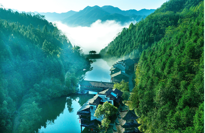 安化梅山文化园恰似一颗熠熠生辉的明珠,深植于湖湘大地。从高空俯瞰,4000亩园区浑然天成,如一幅壮阔的山水长卷缓缓铺展。近80处景点星罗棋布,古烽火台、吊脚楼、风雨廊桥等建筑依山傍水,与自然景观和谐共生,承载着古梅山地区深厚的历史、人物、民俗、艺术底蕴,每一处细节都在诉说着往昔的岁月风云。