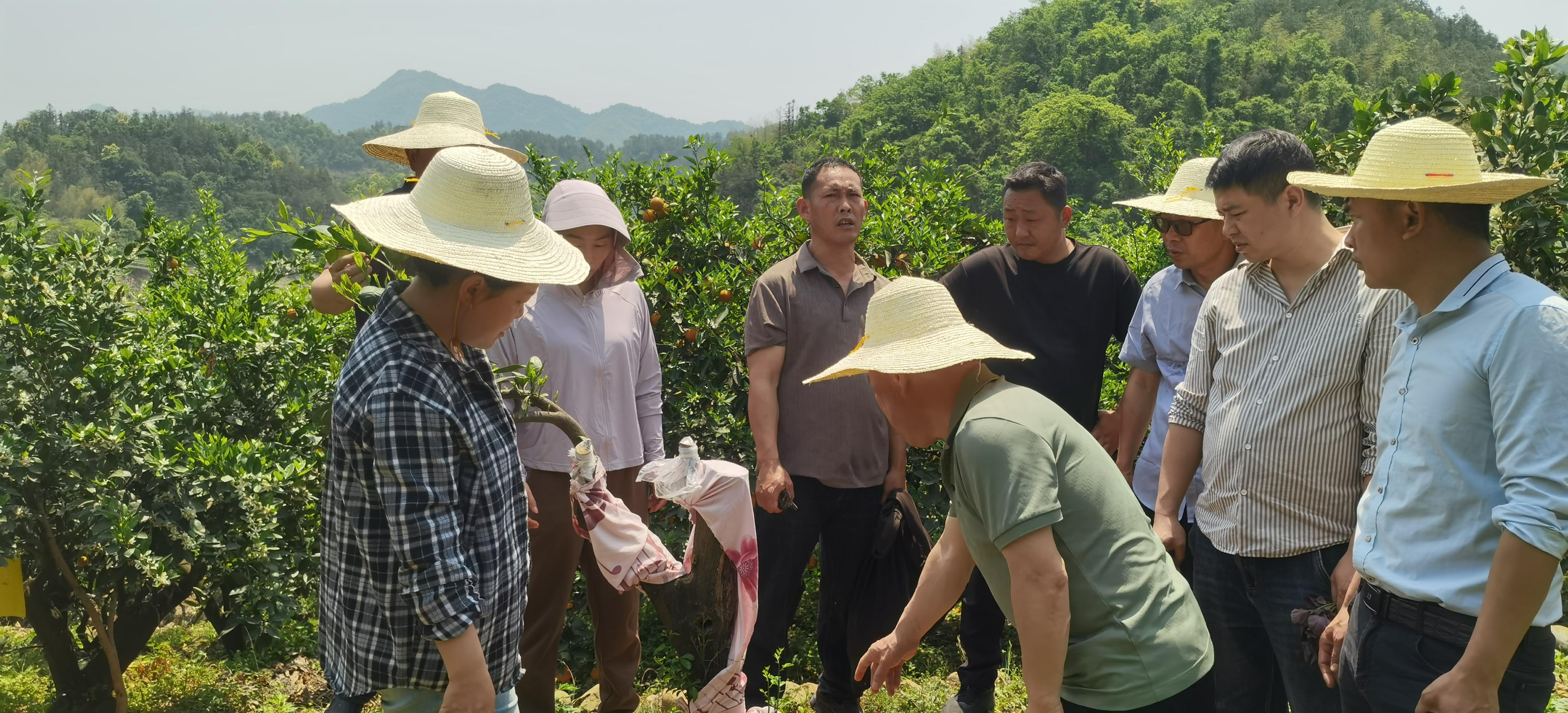 服务团水果专家认真查看柑橘苗长势后,建议基地对新品种加强肥水田间管理,特别强化机械化作业、水肥一体化系统管理,解决存在的坡地灌溉难题。针对库区多雨高湿气候,服务团支招实施“三防两控”技术体系,防裂果、日灼、根腐,控枝梢旺长和病虫害交叉感染。