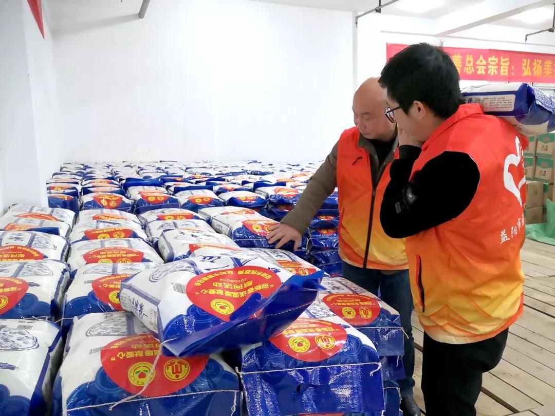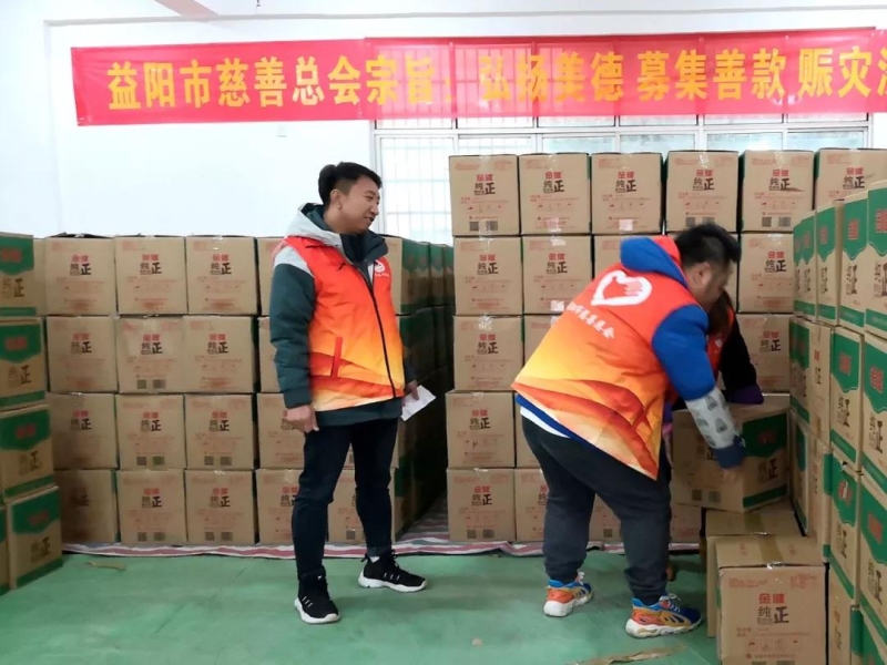 1月14日上午,记者在益阳市慈善总会看到,这里成堆的大米、食用油等慰问物资填满了整个仓库,10多名身穿红马甲的志愿者正忙着把这些慰问物资搬运上车。