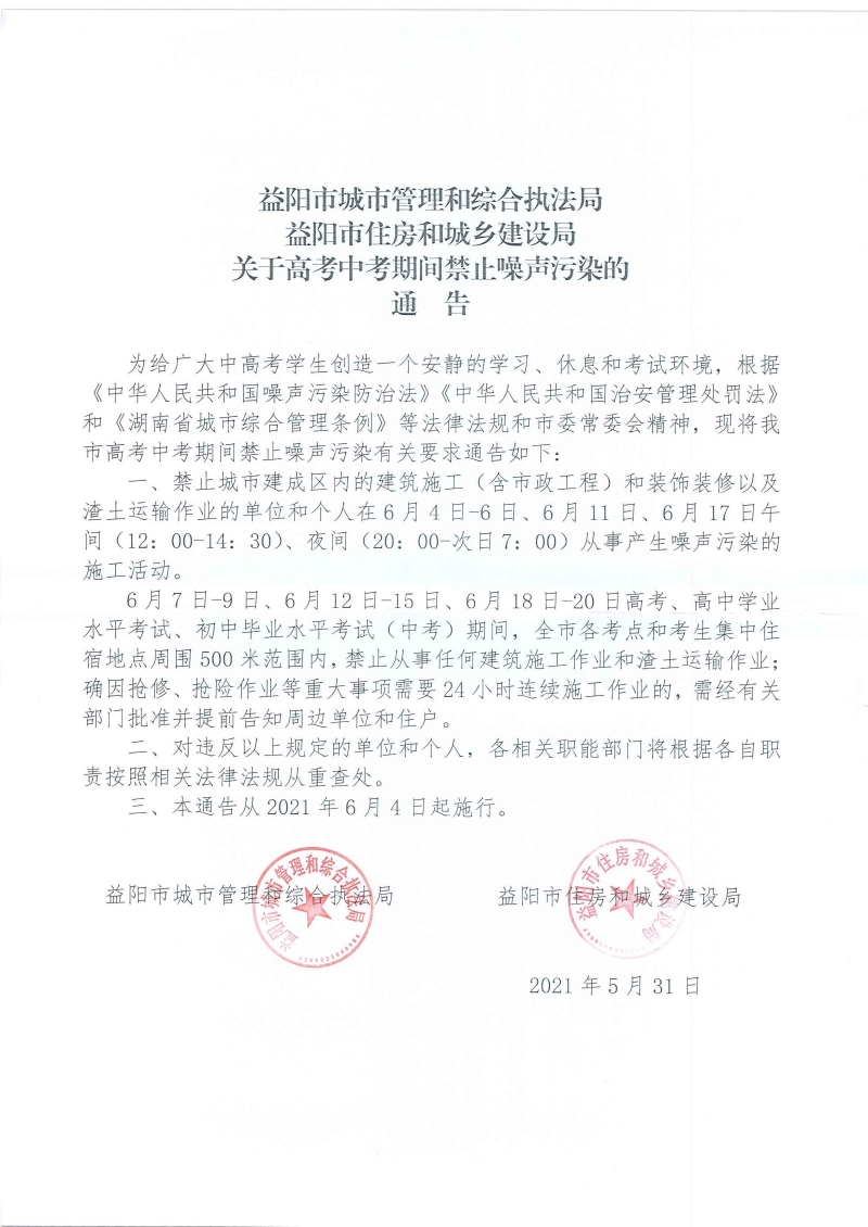 为给广大中高考学生创造一个安静的学习、休息和考试环境,根据《中华人民共和国噪声污染防治法》《中华人民共和国治安管理处罚法》和《湖南省城市综合管理条例》等法律法规和市委常委会精神,现将我市高考中考期间禁止噪声污染有关要求通告如下: