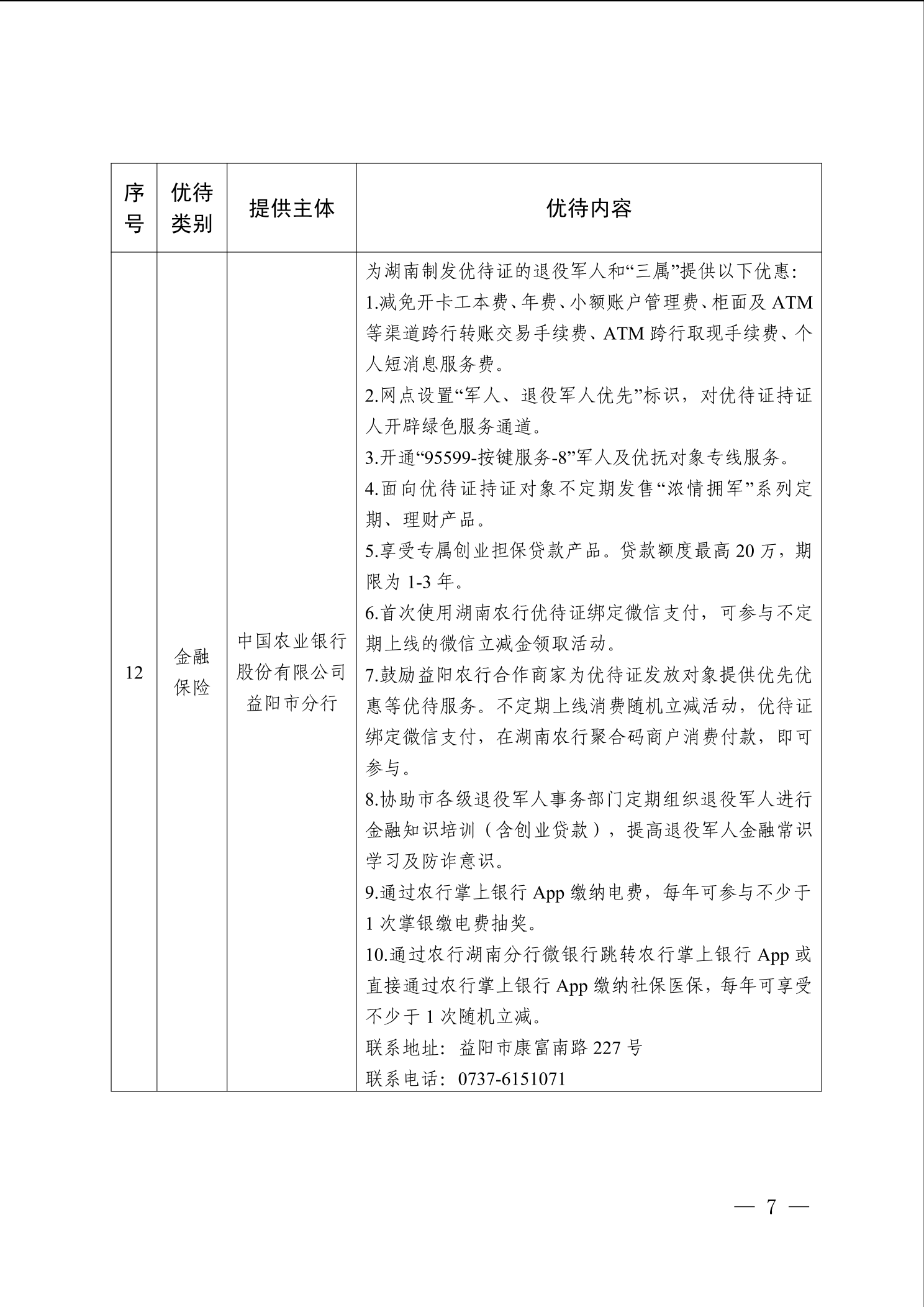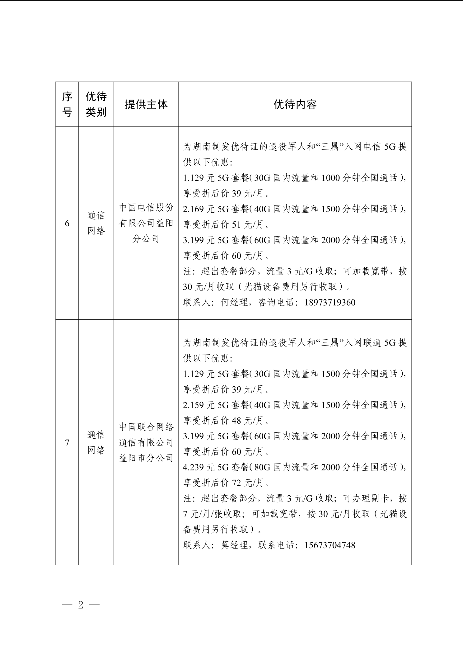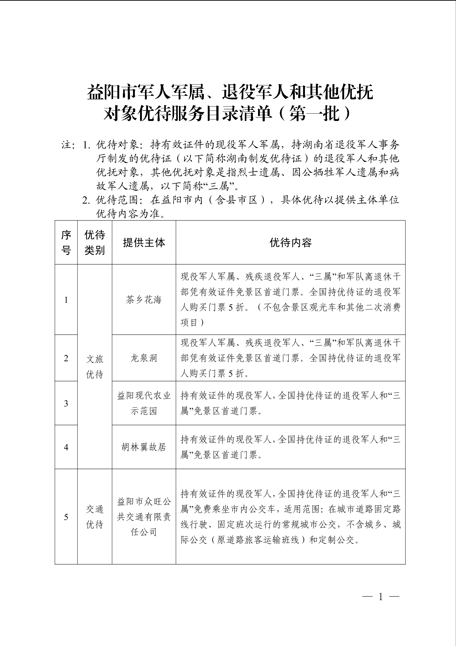 为深入贯彻落实习近平总书记关于退役军人工作的重要论述,在市委、市政府的正确领导下,全市各级退役军人事务部门广泛动员社会力量努力提高优待证“含金量”,让退役军人和其他优抚对象获得感成色更足、幸福感更可持续、安全感更有保障。在中华人民共和国成立74周年之际,现面向社会公布益阳市军人军属、退役军人和其他优抚对象优待服务目录清单(第一批),内容涉及文化旅游、交通优待、通信网络、石油化工、金融保险、医疗康养、其他优待7大类,共计18项,现予以公告。