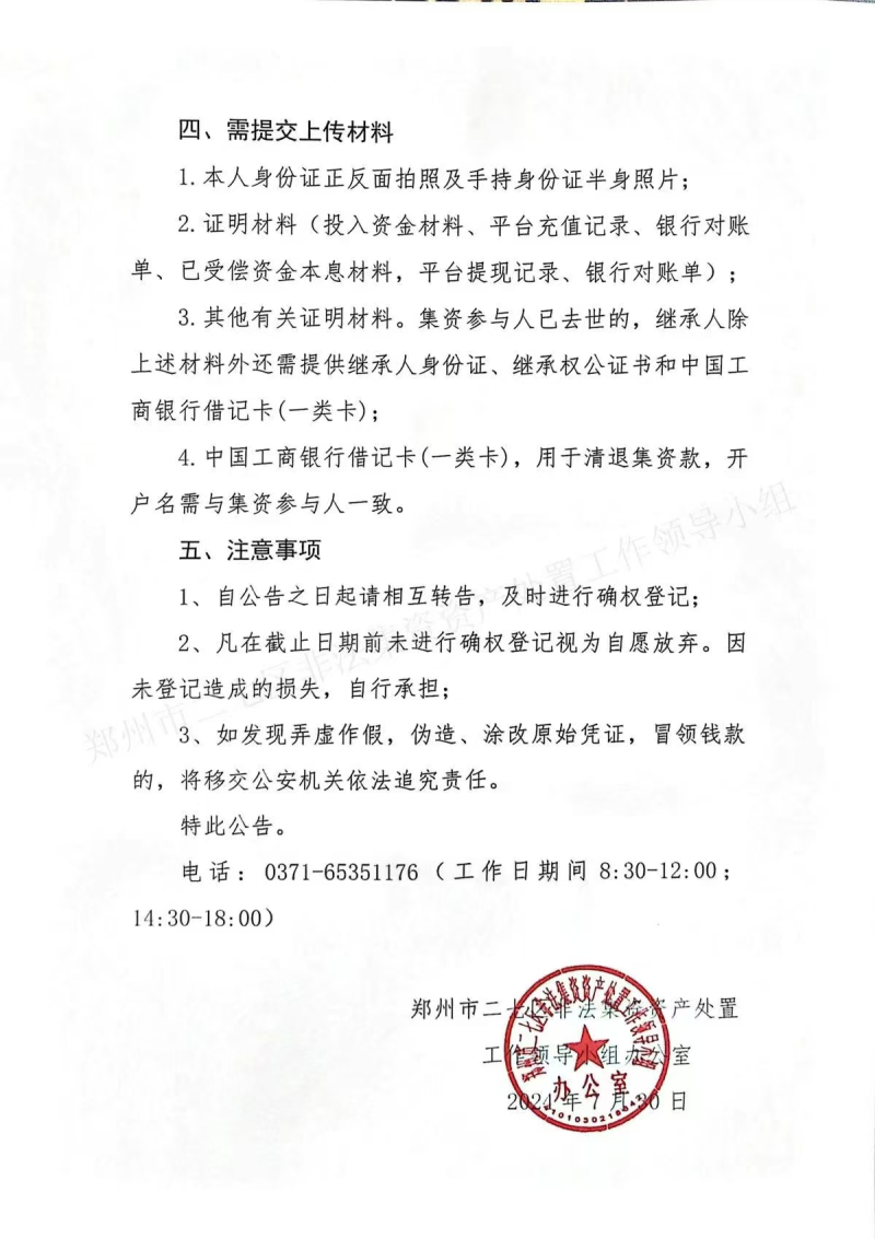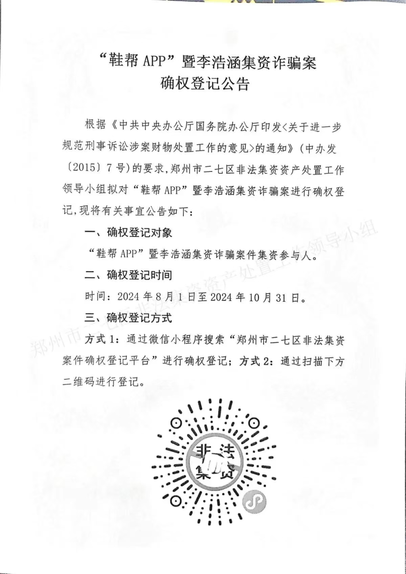 根据《中共中央办公厅国务院办公厅印发<关于进一步规范刑事诉讼涉案财物处置工作的意见>的通知》(中办发〔2015〕7号)的要求,郑州市二七区非法集资资产处置工作领导小组拟对“鞋帮APP”暨李浩涵集资诈骗案进行确权登记,现将有关事宜公告如下: