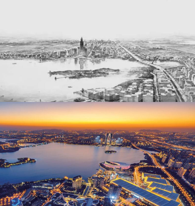 上图是1994年苏州工业园原总规划师时匡在园区建设之初手绘的一张规划蓝图,下图是如今繁华的苏州工业园区。
