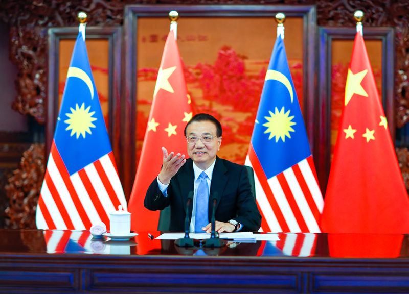 国务院总理李克强5月21日上午在中南海紫光阁同马来西亚总理穆希丁举行视频会晤。