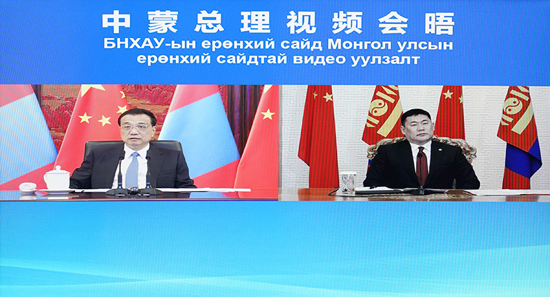 李克强表示,中蒙是山水相连的邻邦。两国关系发展良好,务实合作持续推进。今年7月,习近平主席同呼日勒苏赫总统通话,就深化中蒙关系发展达成重要共识。当前两国都面临抗击疫情、发展经济、保障民生的任务。双方加强合作对两国、对地区都有利。