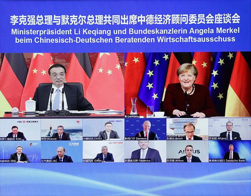 10月18日,国务院总理李克强在北京中南海紫光阁与德国总理默克尔以视频方式共同出席中德经济顾问委员会座谈会,并同与会代表交流。新华社记者 刘彬 摄