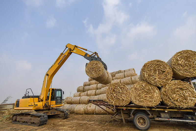 2020年11月12日,在吉林省四平市福港秸秆收储有限公司,农业机械搬运打包好的秸秆。新华社记者 张楠 摄