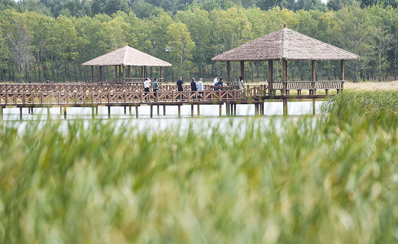 游客在吉林省松原市查干湖野鸭岛参观游览(9月18日摄)。新华社记者 许畅 摄