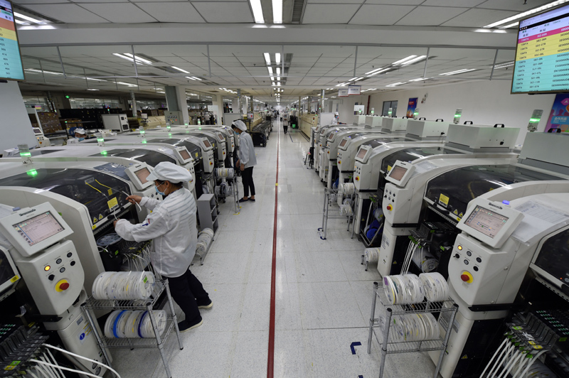 工人在位于安徽合肥的联宝(合肥)电子科技有限公司生产车间内忙碌(2020年3月5日摄)。新华社记者 周牧 摄