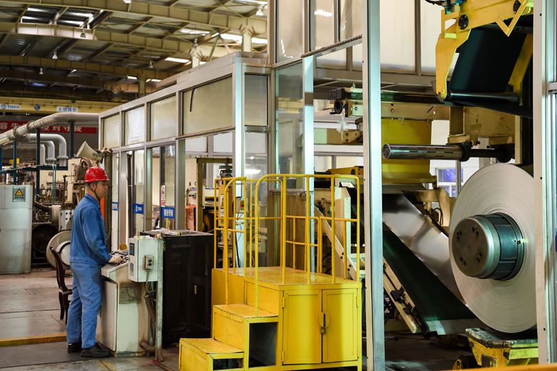 在位于山西省太原市的太钢不锈钢精密带钢公司,工人在操控宽幅精密带钢箔材的加工设备(2020年7月19日摄)。新华社记者 曹阳 摄