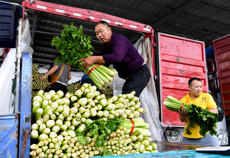 在位于河南省郑州市中牟县的河南万邦国际农产品物流城,工作人员在搬运蔬菜(2021年7月22日摄)。新华社记者 郝源 摄