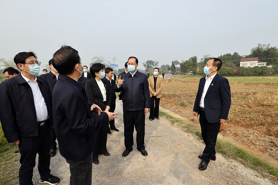 28日,毛伟明在临澧县修梅镇高桥村考察高标准农田示范片。