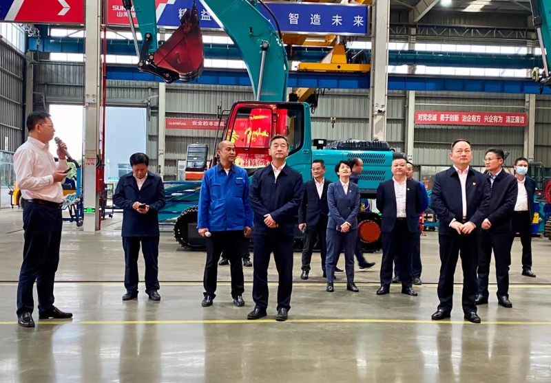 沿着习近平总书记考察山河智能的路线,陈竞一行来到挖掘机装配车间,重温了习近平总书记在山河智能考察时的重要讲话精神。山河智能有关负责人向陈竞一行介绍了企业发展历程和近年装备制造研发情况。山河智能装备集团创立于1999年,总资产180亿元。近年来,企业立足装备制造业,在创始人何清华教授的带领下,按照“先导式创新”模式,在地下工程装备、全系列挖掘机、现代凿岩设备、特种装备、矿山装备、起重机械、液压元器件和通用航空装备等十多个领域,成功研发出200多个具有自主知识产权和核心竞争力的高端装备产品。企业跻身全球工程机械企业50强,全球挖掘机企业20强,全球支线飞机租赁企业3强。