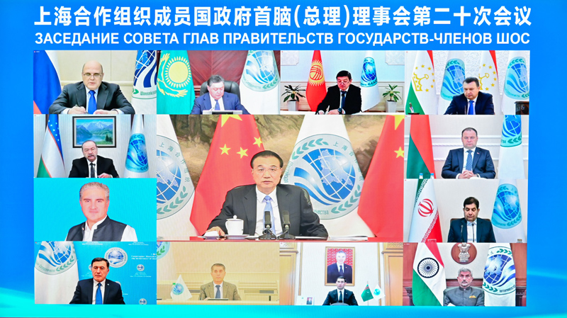 11月25日,国务院总理李克强在北京人民大会堂出席上海合作组织成员国政府首脑(总理)理事会第二十次会议。会议以视频方式举行。新华社记者 翟健岚 摄