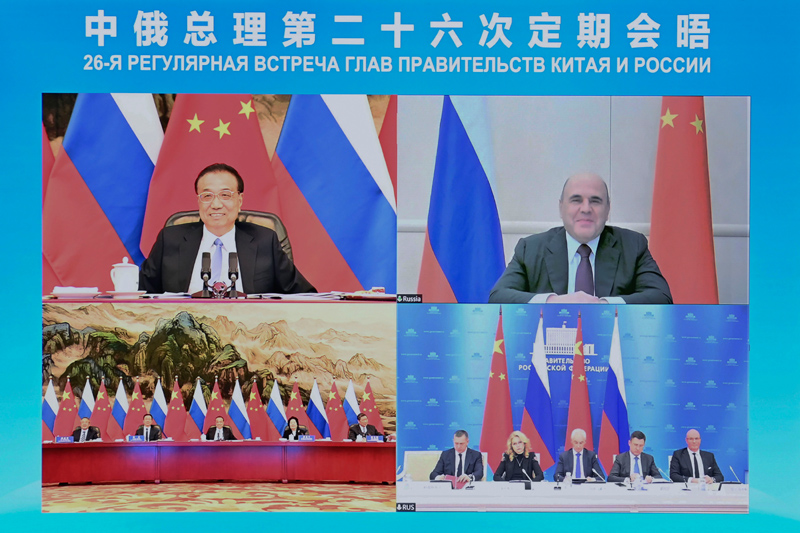11月30日下午,国务院总理李克强在北京人民大会堂与俄罗斯总理米舒斯京共同主持中俄总理第二十六次定期会晤。会晤以视频方式举行。国务院副总理、中俄投资合作委员会、能源合作委员会中方主席韩正出席。新华社记者 李响 摄