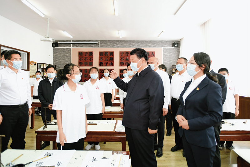 2021年9月13日至14日,中共中央总书记、国家主席、中央军委主席习近平在陕西省榆林市考察。这是14日上午,习近平在绥德实验中学考察时,同正在练习书法的学生亲切交流。新华社记者 李学仁/摄