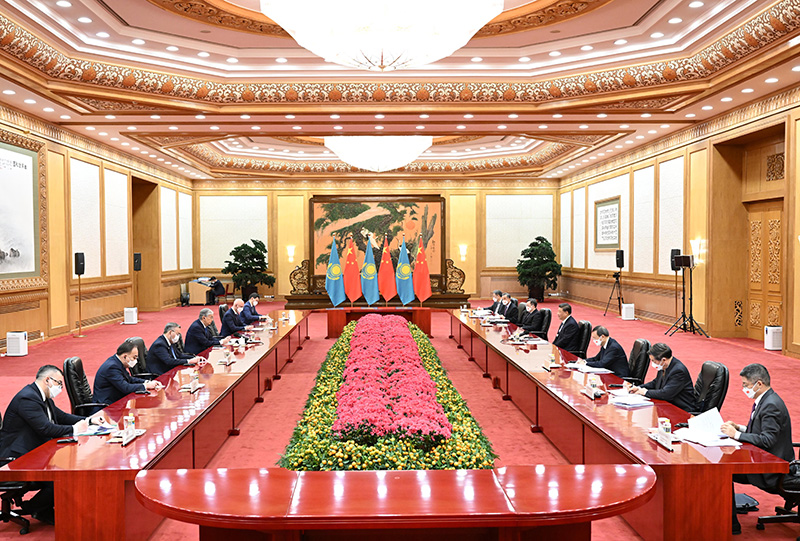 2月5日上午,国家主席习近平在北京人民大会堂会见来华出席北京2022年冬奥会开幕式的哈萨克斯坦总统托卡耶夫。新华社记者 李响 摄