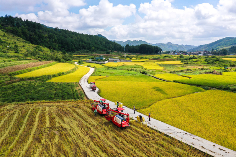 2021年9月15日,贵州省龙里县湾滩河镇羊场社区的农民在抢收稻谷(无人机照片)。新华社记者 杨文斌 摄