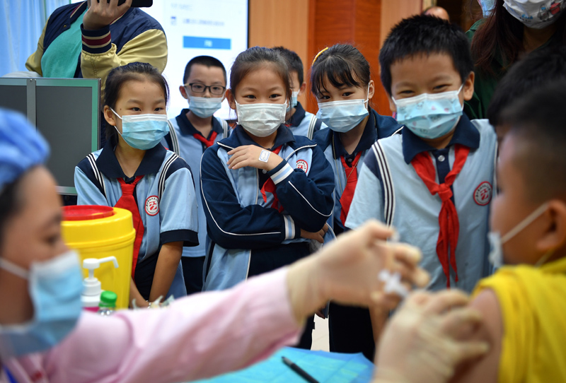 2021年10月28日,海南省海口市琼山第三小学的学生排队接种疫苗。新华社记者 郭程 摄