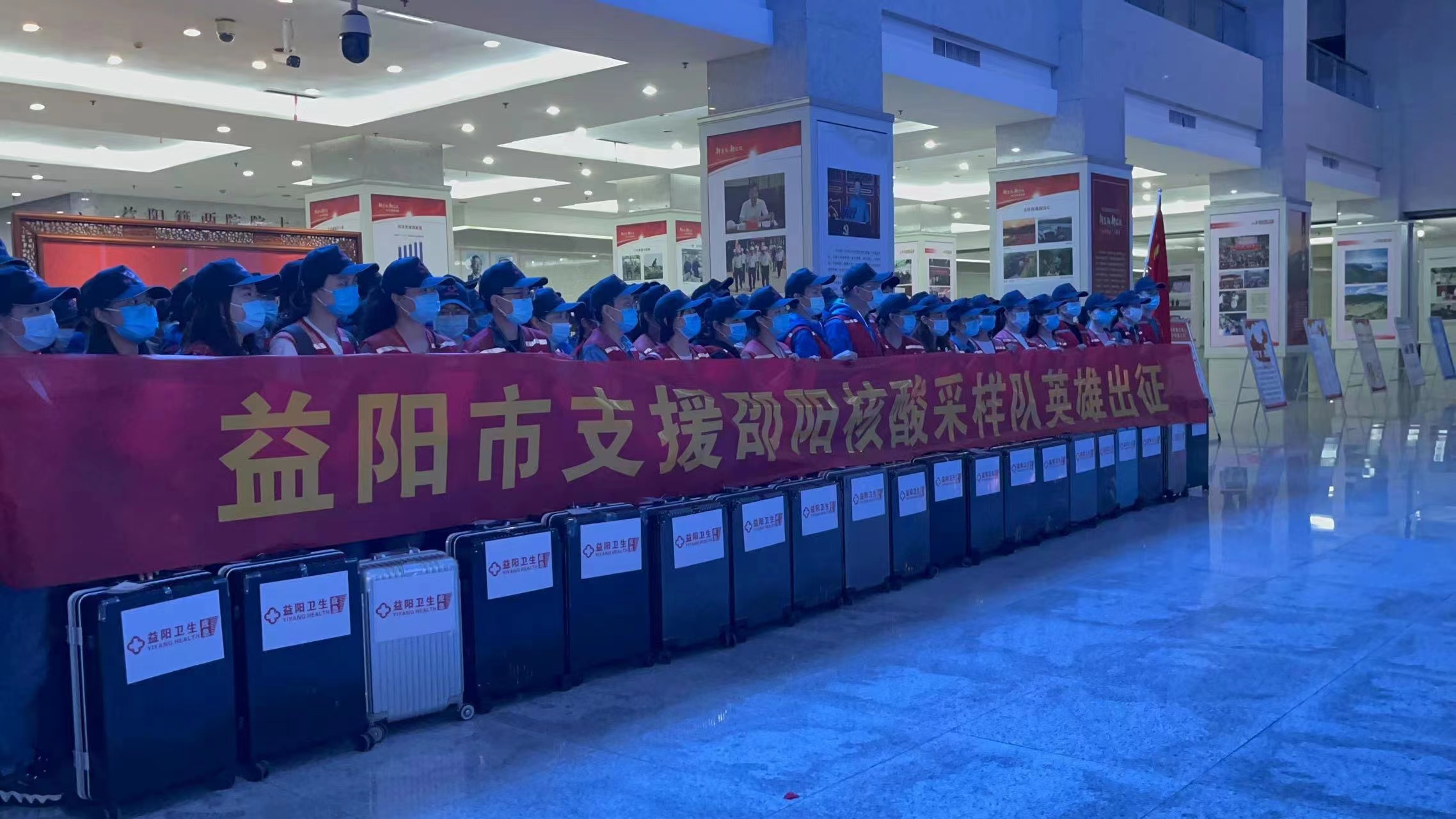 4月22日,我市120名医护人员紧急驰援邵阳,支援当地疫情防控工作。当晚9时,益阳市支援邵阳市核酸采样队出征仪式在市政府一楼大厅举行。副市长罗晓皓出席仪式,并为支援邵阳核酸采样队临时党支部授旗。