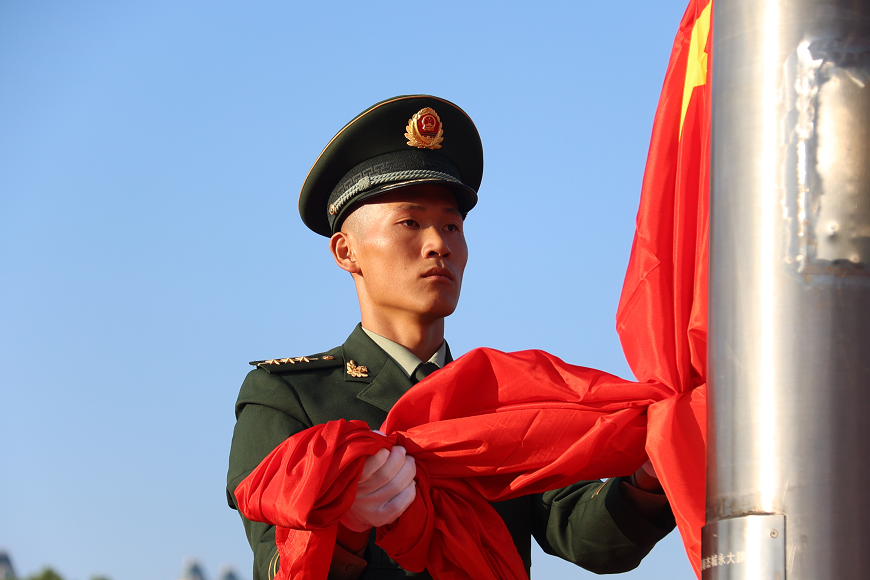 早上8时整,武警国旗护卫队队员迈着矫健整齐的步伐,护卫着五星红旗走向升旗台。“起来!不愿做奴隶的人们……”随着现场响起雄壮的国歌声,升旗手振臂一挥,鲜艳的五星红旗迎风展开,冉冉升起。全体人员肃然而立,向五星红旗行注目礼,现场的少先队员庄重地举起右手,向国旗敬少先队队礼,对伟大祖国致以无限敬意和深深祝福。