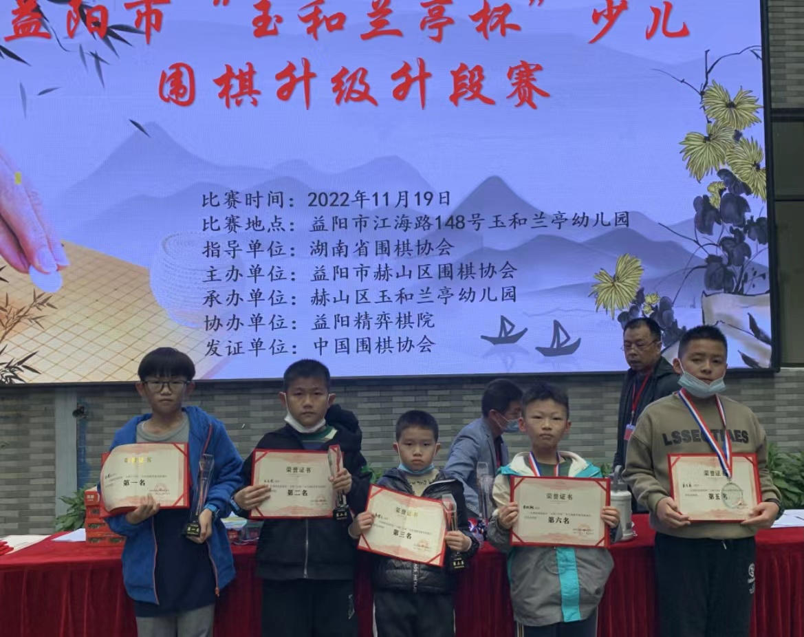 11月19日,由湖南省围棋协会指导、赫山区围棋协会主办的益阳市少儿围棋升级升段赛在玉和兰亭幼儿园举行。来自全市各中小学、幼儿园的176名少儿棋手展开对弈。市人大常委会副主任、市总工会主席杨丽萍为获奖棋手颁奖。
