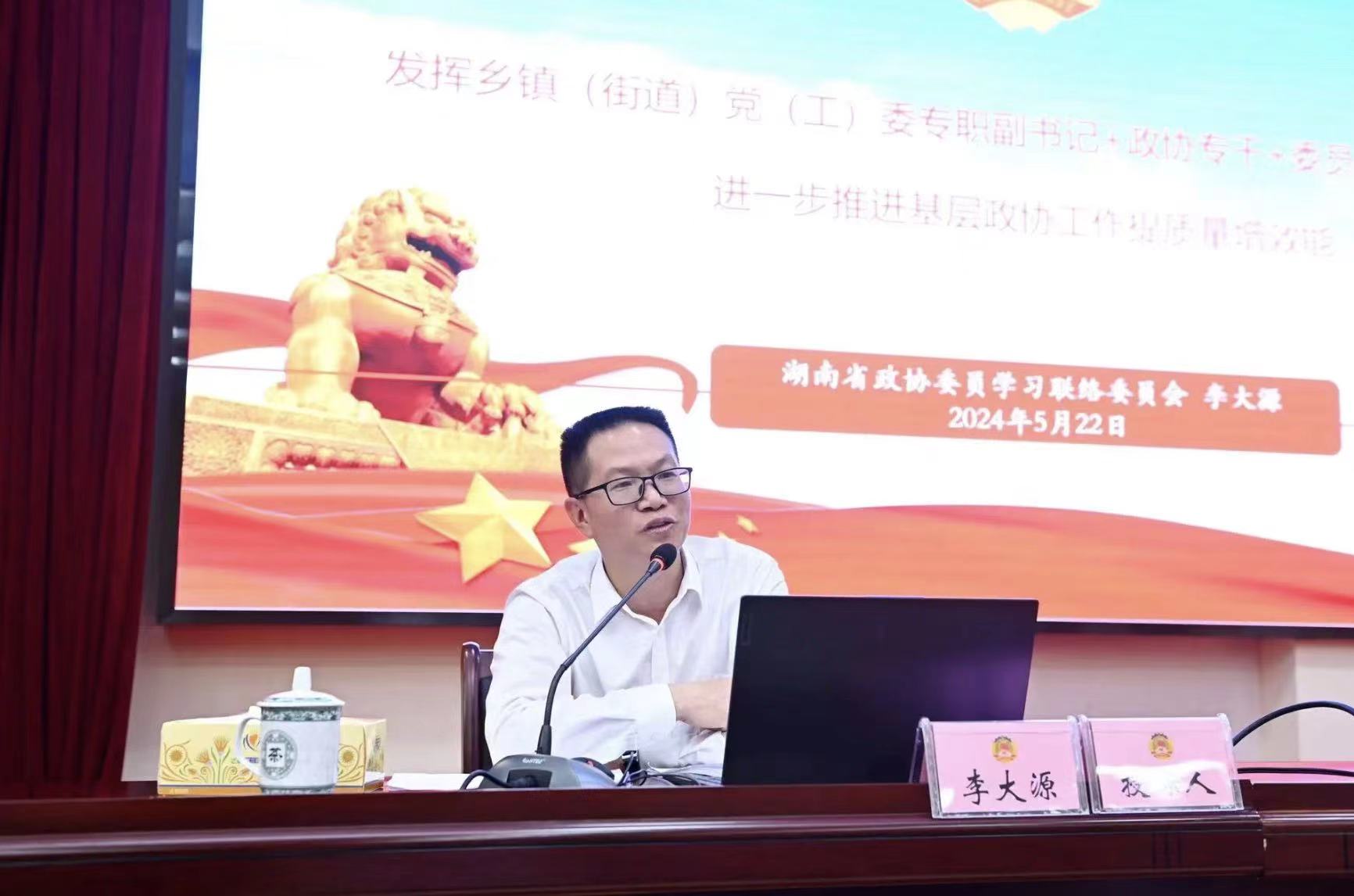 李大源以《发挥乡镇(街道)党(工)委专职副书记+政协专干+委员工作室机制作用,进一步推进基层政协工作提质量增效能》为题,深入阐释人民政协的形成与发展,并就发挥政协职能优势、基层政协工作提质增效等进行细致讲解。