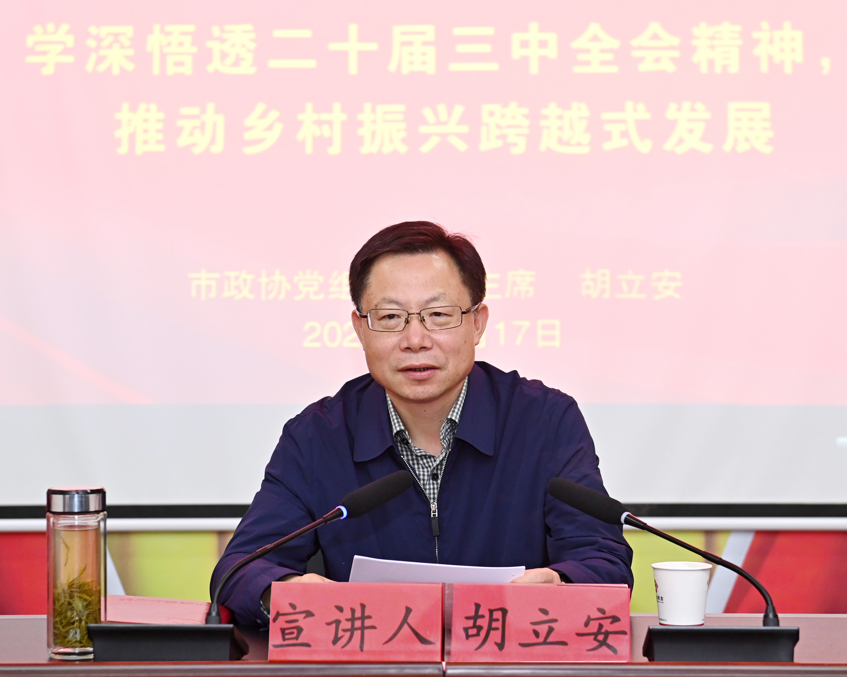 10月17日,市政协主席胡立安赴安化县滔溪镇新联村开展党的二十届三中全会精神宣讲。他强调,要原原本本地学习党的二十届三中全会精神和《中共中央关于进一步全面深化改革、推进中国式现代化的决定》,深刻掌握其精神实质和核心要义,真正做到内化于心、外化于行,将其融入工作实际之中,转化为推动高质量发展的生动实践。