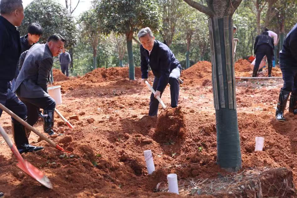 三月的银城大地春蕾绽放、万物勃发。陈竞、邓斌、胡立安等市领导来到植树点,与大家一起挥锹铲土、扶树正苗、培土踩实、提水浇灌,现场一派热火朝天的繁忙景象。经过一番辛勤劳作,香樟、桂花、红花玉兰、樱花、红叶石楠等400余株树木扎根沃土,焕发出勃勃生机。