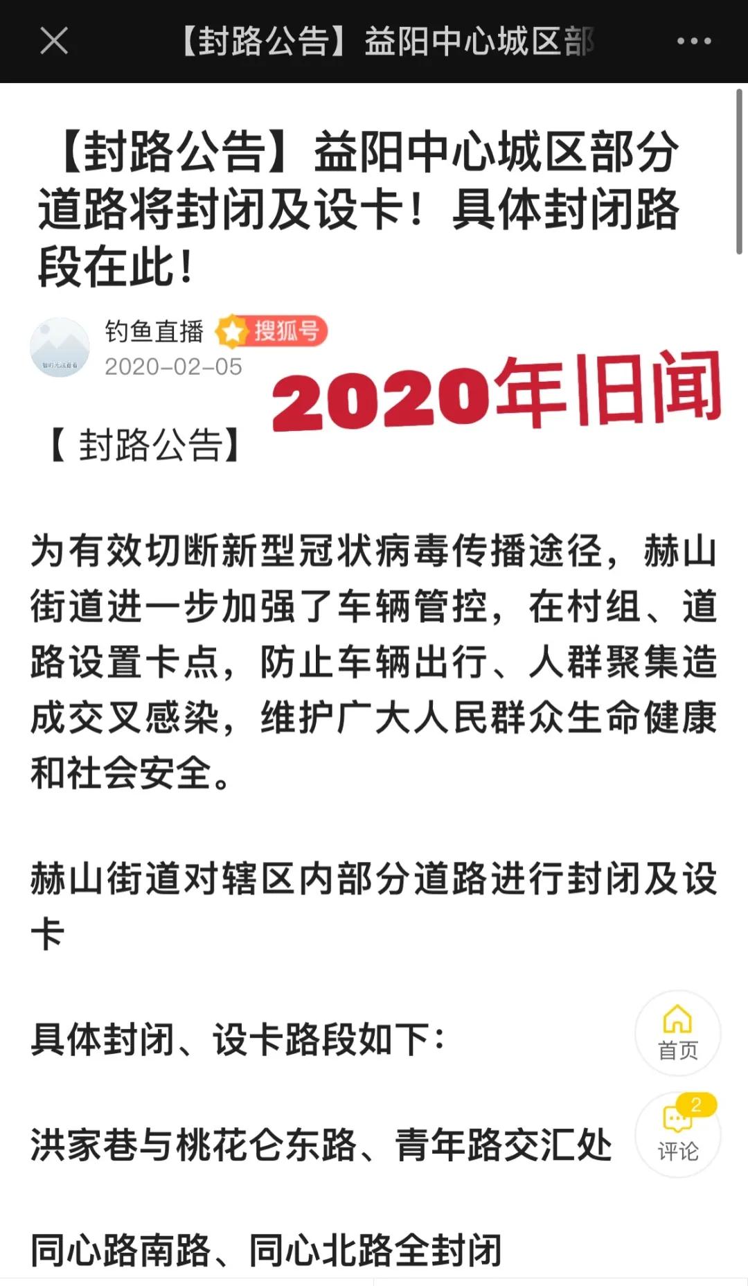 此外,一则《益阳中心城区部分道路将封闭及设卡!具体封闭路段在此!》的文章也为不实信息。该文中提及的封路信息,是去年2月疫情期间实行的管控措施。 市疫情防控办提醒市民朋友们:不要随意转发未经证实的信息,流传到网络上误导公众,可能会给您带来严重的法律后果。同时,请广大市民严格落实防控措施,坚决防范疫情风险。