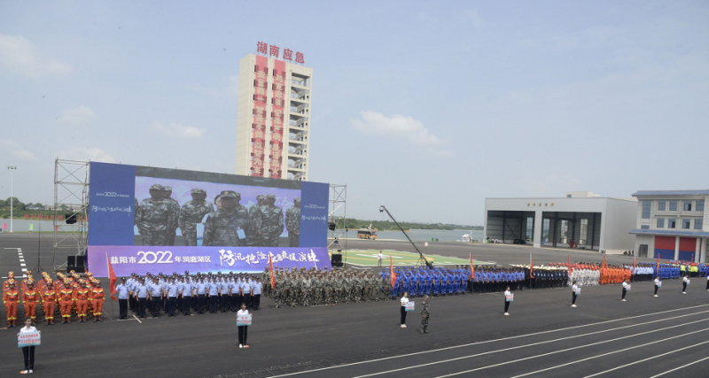 原来,这里正在举行益阳市2022年防汛抢险应急救援演练活动,16个方阵620余人参加了此次防汛抢险应急救援演练。此次演练以市域内发生强降雨、主要河流水位超警戒为背景,采取现场实战的方式,对信息传递、会商研判、决策指挥、抗洪抢险、撤离转移、救灾安置等环节进行演练。
