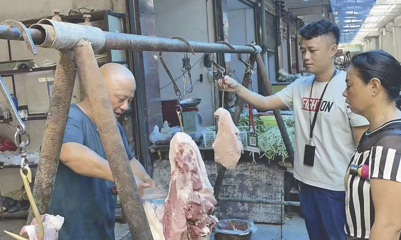 市监所工作人员检查售卖生猪肉的门店、摊位。