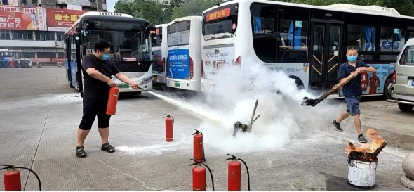 这是6月29日益阳湘运公交分公司消防应急演练活动的一个重要环节。据了解,此次消防演练的目的是让驾驶员进一步熟悉新能源车火灾特点、原因以及处置办法。