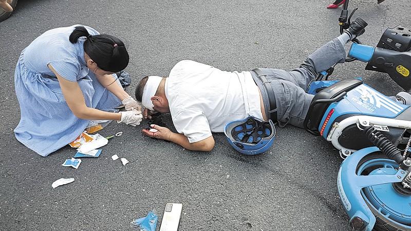 6月26日,中心城区金山路紫金山酒店附近,一市民骑共享电动车不小心撞上路边一小车后摔倒在地,额头擦伤,血流不止。市人民医院主管护师谢立运正好路过,还随身携带了急救包。她当即为市民包扎止血,中心医院的救护车来以后,她又护送伤者上车去医院治疗。 刘华 摄