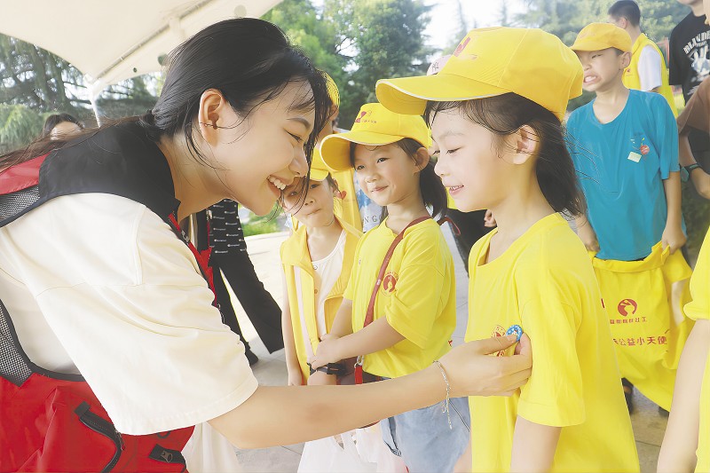 领队老师为环保小卫士讲解环境保护的意义、垃圾分类的基础知识和环保小卫士的岗位职责。小朋友们穿好黄马甲,分成两组,围绕公园分头行动,开始“环境保护之旅”。小卫士们戴着手套,拿着垃圾袋,每走一处都能拾起不少和落叶混在一起的烟头、槟榔渣。尽管天气炎热,但大家没有抱怨。“这些小志愿者的一举一动,不仅是对环保公益活动的支持,更有利于他们养成爱卫生的好习惯。”在领队老师看来,小卫士们都理解了这次实践活动的意义。最后大家分享自己的心得体会,领队老师为小卫士们颁发奖章。