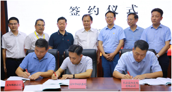 签约仪式上,益阳市城市建设投资运营集团有限责任公司党委副书记、副董事长、总经理刘俊伟,湖南益阳公路桥梁建设有限责任公司总经理龙庆辉,长安益阳发电有限公司总经理吴磊,分别代表企业签订三方项目合作协议书。