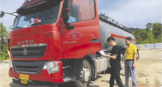 市道路运输服务中心工作人员对危货运输车进行安全检查。