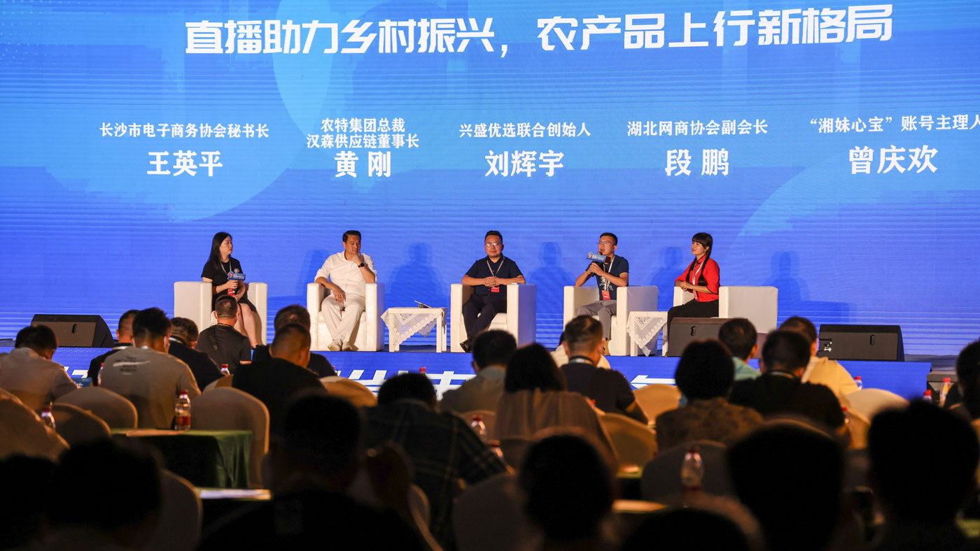随后,农特集团总裁、汉森供应链董事长黄刚,抖音电商山货上头条负责人殷皓程,“湘妹心宝”账号主理人曾庆欢,惠农网联合创始人邓武杰,分别以《数字农业、科技农业趋势下的农产品产地直供》《全域兴趣电商助力农产品区域公用品牌发展》《短视频内容电商经济助力乡村振兴》《“网红+网货”重塑农产品新消费,激活县域产业发展新引擎》为主题,围绕供应链数字化智能化升级、助推优质农产品迈向更高平台、激发县域产业发展更大动能等多角度作了主题演讲。长沙市电子商务协会秘书长王英平,农特集团总裁、汉森供应链董事长黄刚,兴盛优选联合创始人刘辉宇,湖北网商协会秘书长段鹏,“湘妹心宝”账号主理人曾庆欢等专家学者与行业代表参加了“直播助力乡村振兴 农产品上行新格局”圆桌论坛。