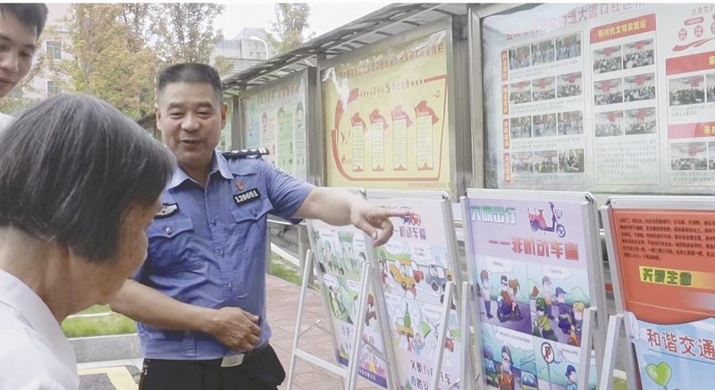交警志愿者给居民宣讲交通安全知识。