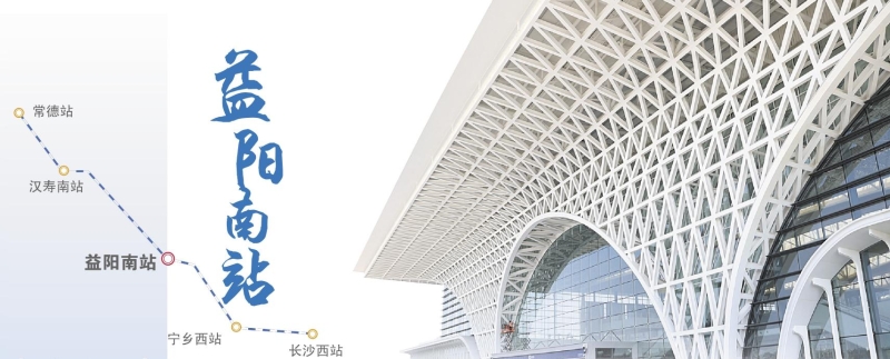 位于益阳高新区寨子仑片区的常益长铁路益阳南站,周边四山环抱,总体造型呈方形,与周边建筑、自然环境形成“天圆地方”之势,规划面积5万平方米,首期建设3.6万平方米(包括市政配套实际建设体量为10万平方米),站房主体为3层,局部4层,站场规模为6台18线,由北向南依次设石长场(2台6线,为既有益阳火车站并入所预留)、厦渝场(2台6线)和呼南场(2台6线,城际铁路与呼南铁路共场)。益阳南站为线侧+高架式旅客站房,客流组织模式为上进下出,广场东侧为两层停车楼,西侧为换乘中心,部分区域两层,车站旅客最高聚集人数为2500人,远期高峰小时旅客发送量2168人,将大大缩短益阳至长沙、常德的时间。“站场设计建设过程中注重一站一景、站城一体,每一处都融入了地方特色文化。”中铁建工集团常益项目相关负责人如是说。结合国铁集团对铁路旅客车站建设的“畅通融合、绿色温馨、经济艺术、智能便捷”十六字建设理念,益阳南站采用大小翅膀的建筑形式,充分体现“文脉交织、崭新腾飞”的建筑创意。益阳是著名“竹都”,益阳南站外立面设计充分结合当地“竹文化”,提取竹文化的三角交织元素,将益阳的历史传统用现代的建筑语言演绎,空间编织钢结构支撑,精致典雅。同时,立面整体上犹如桥梁的剪影,代表益阳与新时代的联通,与核心区自然景观廊道的打通。