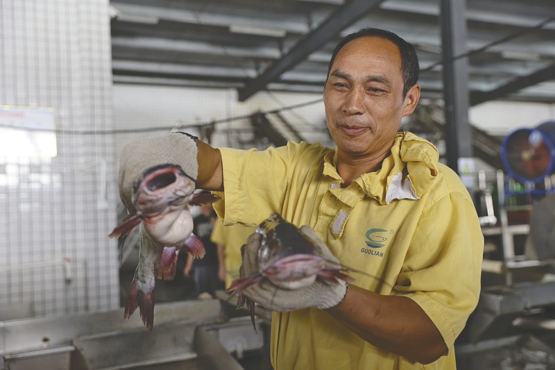 国联水产公司水产品分拣区,工作人员正在挑选活鱼。