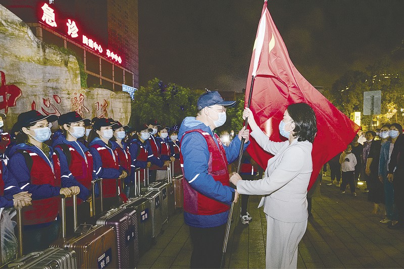 院党委书记胡丽向医院支援邵阳核酸采样队党支部书记、队长谢力全授旗。