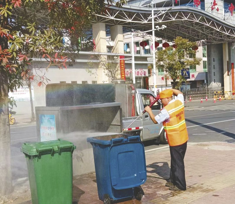 ▲ 环卫工人曾文彬清洗垃圾桶。
