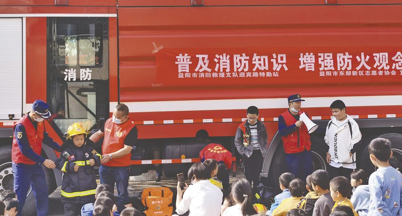 11月7日,益阳市消防救援支队迎宾路特勤站携手益阳东部新区志愿者协会,走进赫山区沧水铺镇花桥学校,联合开展消防宣传进校园活动。五年级学生柳馨雅现场体验后说:“我要把今天学到的消防知识,普及给我身边的人。”