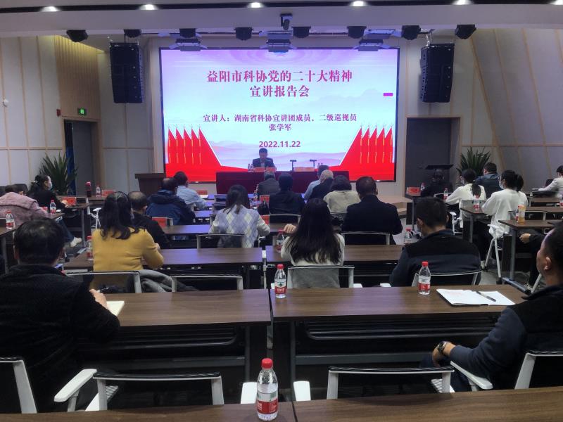为在全市各级科协组织和科技工作者中迅速兴起学习宣传贯彻落实党的二十大精神的热潮,11月21日,市科协特邀湖南省科协宣讲团成员、二级巡视员张学军来益宣讲党的二十大精神。市科协党组书记、主席曹卫兵主持会议。市科协社会组织行业党委各支部书记、资阳区和赫山区科协领导班子成员、市科协机关及所属二级机构干部职工参加宣讲报告会。